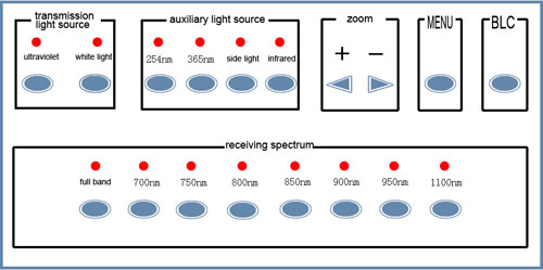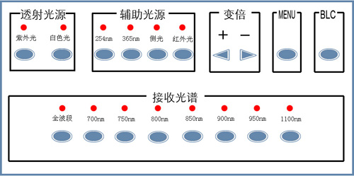 當要顯示票證上熒光暗記、圖案時,按動激發(fā)多波段光源按鈕,選擇合適波段的光源,這樣可獲得紫外熒光效果。